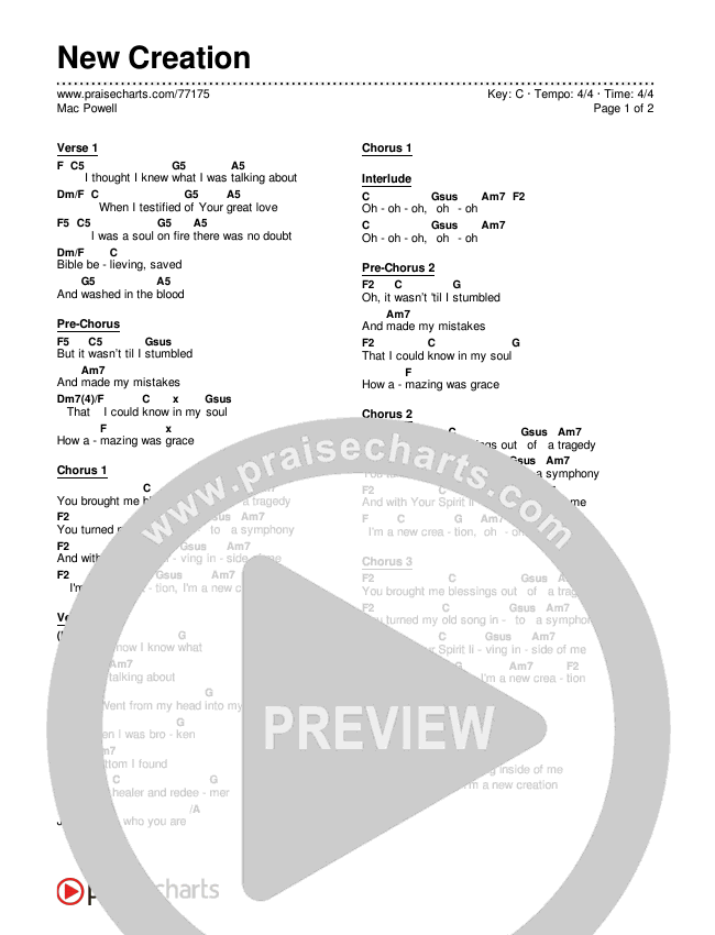 Download the PDF Chord Charts for New Creation by Mac Powell, from the album New Creation. This song was arranged by Grant Wall in the key of C, D.