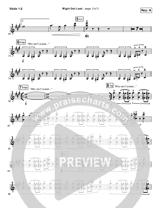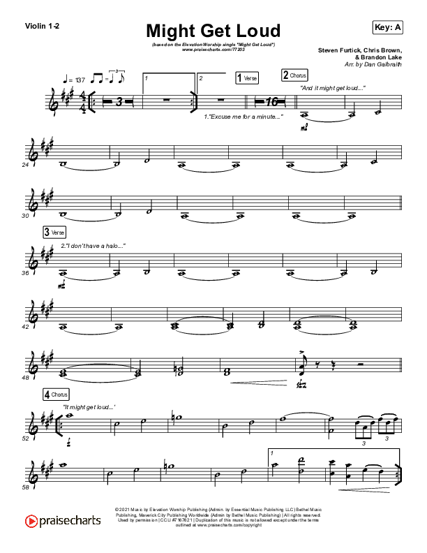 Download the Violin sheet music for Might Get Loud by Elevation Worship / Chris Brown / Brandon Lake / Tiffany Hudson, from the album LION. This song was arranged by Daniel Galbraith in the key of A, Bb.