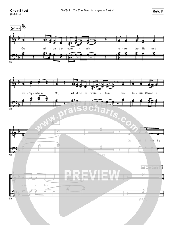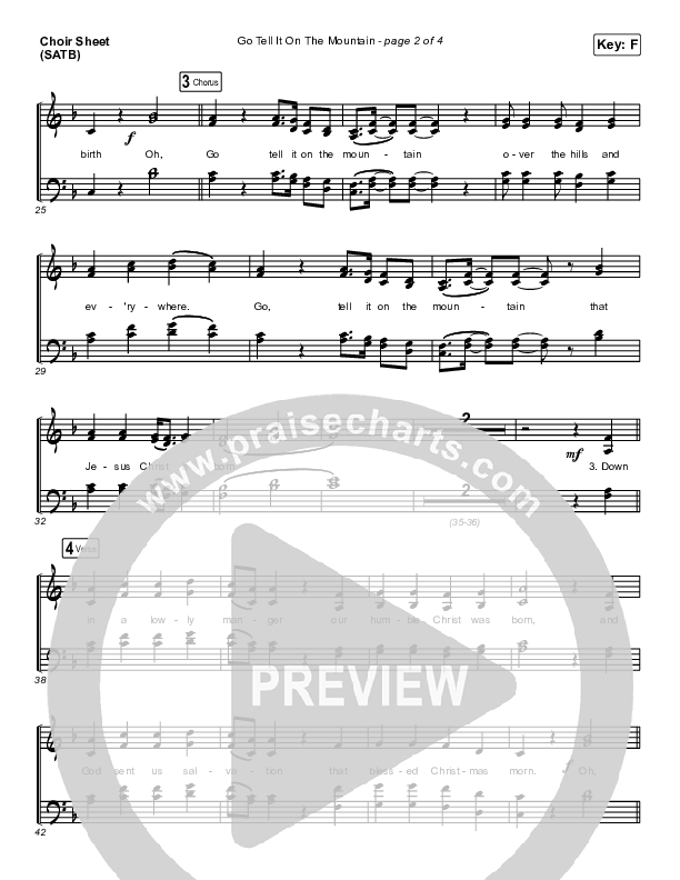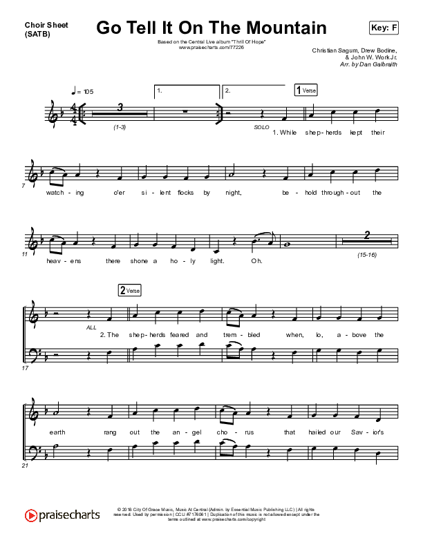 Download the Choir Sheet for Go Tell It On The Mountain by Central Live, from the album Thrill Of Hope. This song was arranged by Daniel Galbraith in the key of E, F.