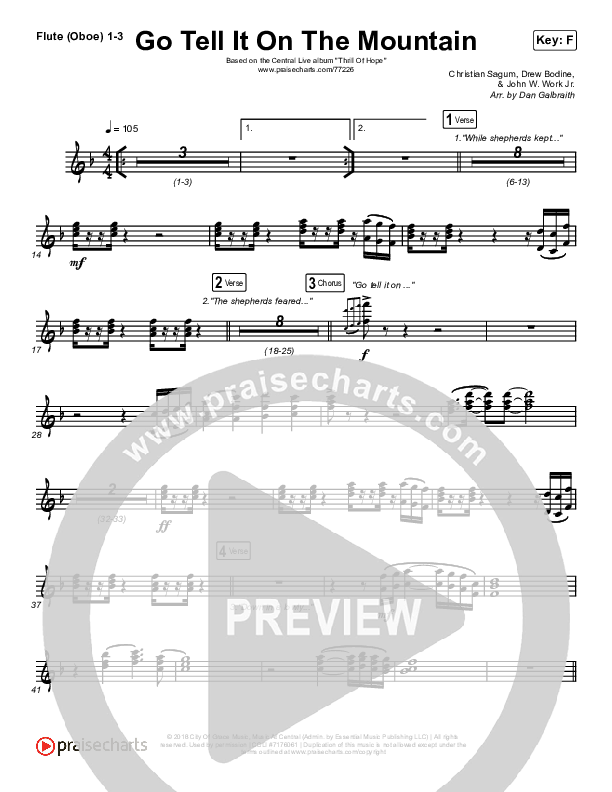 Download the Orchestration wind parts for Go Tell It On The Mountain by Central Live, from the album Thrill Of Hope. This song was arranged by Daniel Galbraith in the key of E, F.