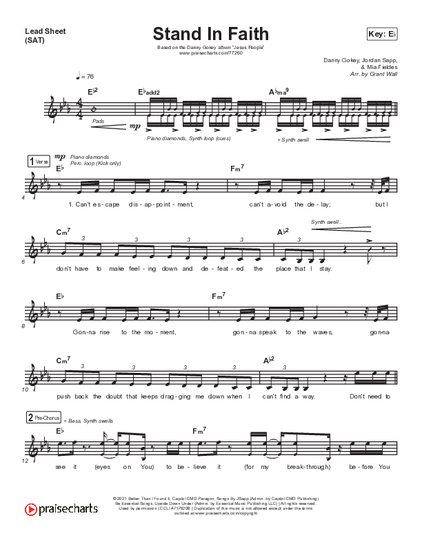 Download the sheet music for Stand In Faith by Danny Gokey, from the album Jesus People. This song was arranged by Grant Wall in the key of D, Eb.