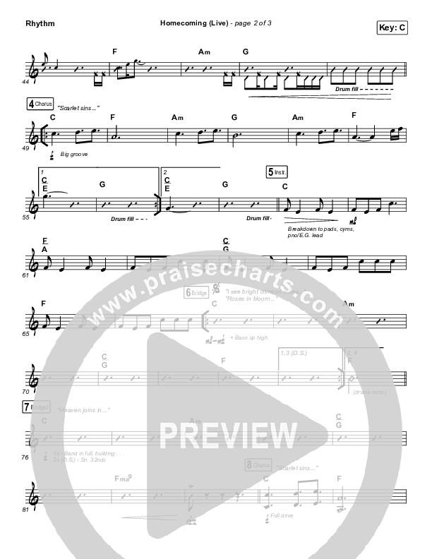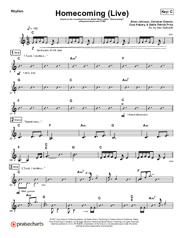 Download the Rhythm Chart for Homecoming (Live) by Bethel Music / Cory Asbury / Gable Price, from the album Homecoming. This song was arranged by Daniel Galbraith in the key of Bb, C.
