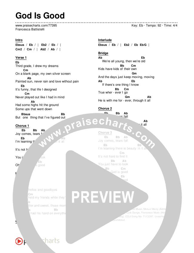 Download the PDF Chord Charts for God Is Good by Francesca Battistelli, from the album God Is Good.