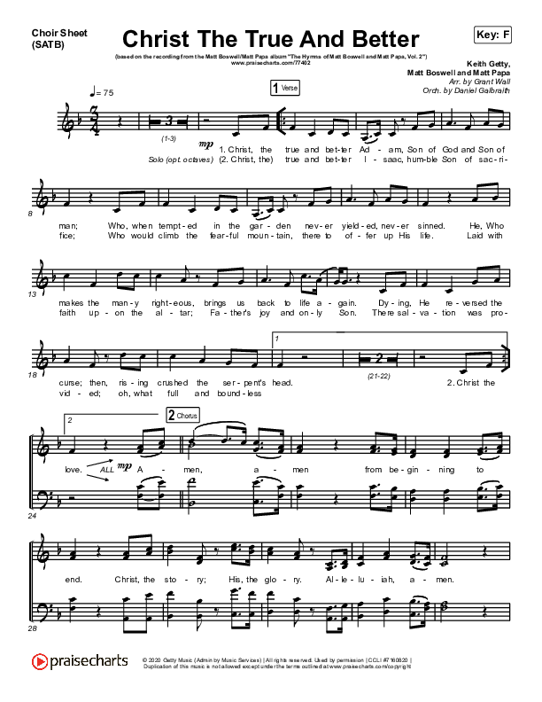 Download the Choir Sheet for Christ The True And Better by Matt Boswell / Matt Papa, from the album Almost Home - The Hymns Of Matt Boswell And Matt Papa Vol 2. This song was arranged by Grant Wall / Daniel Galbraith in the key of E, F.