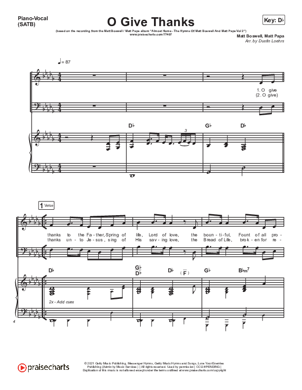 Download the sheet music for O Give Thanks by Matt Boswell / Matt Papa, from the album Almost Home - The Hymns Of Matt Boswell And Matt Papa Vol 2. This song was arranged by Dustin Loehrs in the key of D, Db.