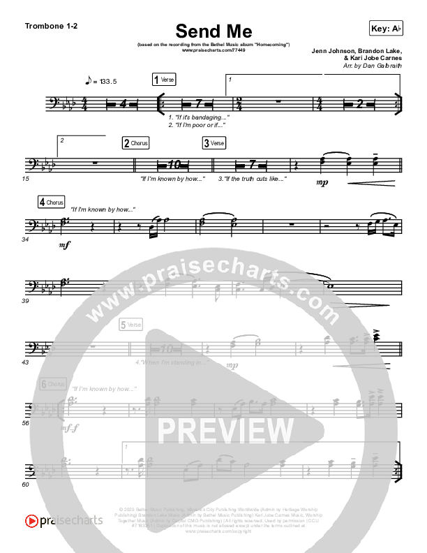 Download the Trombone 1,2 sheet music for Send Me (Live) by Bethel Music / Jenn Johnson / Chris Quilala, from the album Homecoming. This song was arranged by Daniel Galbraith in the key of A, Ab, G.