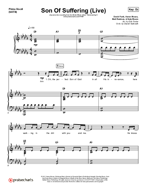 Download the sheet music for Son Of Suffering (Live) by Bethel Music / David Funk / Matt Redman, from the album Homecoming. This song was arranged by Erik Foster / Daniel Galbraith in the key of Bb, C, Db.