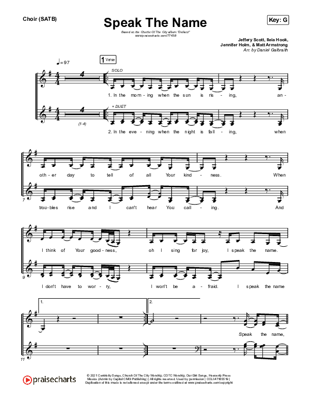 Download the Choir Sheet for Speak The Name by Church Of The City / Ileia Sheraé, from the album Defiant Joy. This song was arranged by Daniel Galbraith in the key of Ab, G.