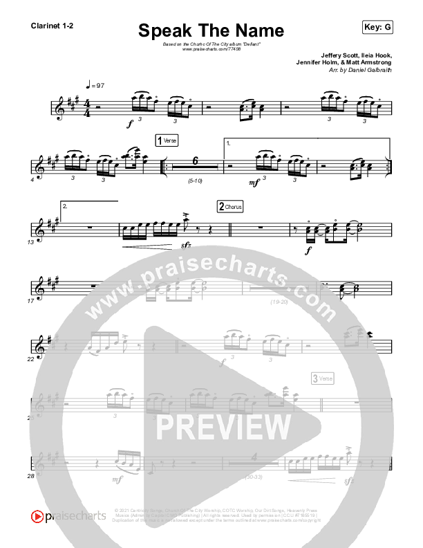 Download the Clarinet sheet music for Speak The Name by Church Of The City / Ileia Sheraé, from the album Defiant Joy. This song was arranged by Daniel Galbraith in the key of Ab, G.
