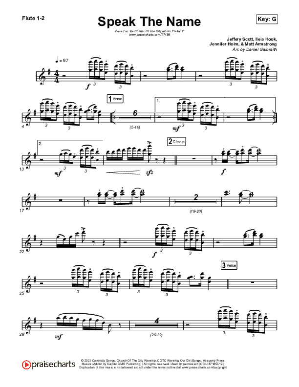 Download the Flute sheet music for Speak The Name by Church Of The City / Ileia Sheraé, from the album Defiant Joy. This song was arranged by Daniel Galbraith in the key of Ab, G.