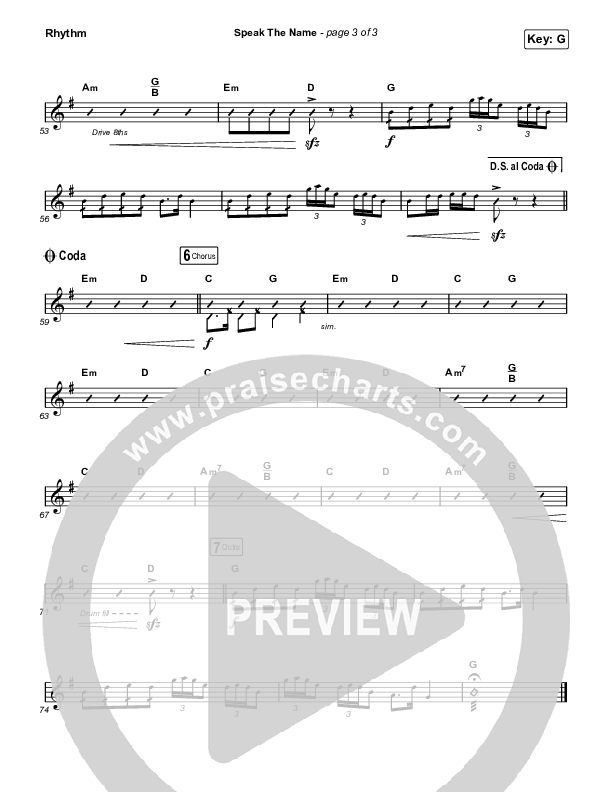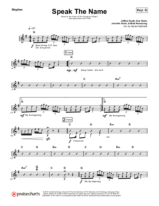 Download the Rhythm Chart for Speak The Name by Church Of The City / Ileia Sheraé, from the album Defiant Joy. This song was arranged by Daniel Galbraith in the key of Ab, G.
