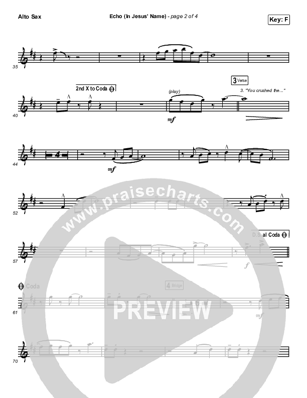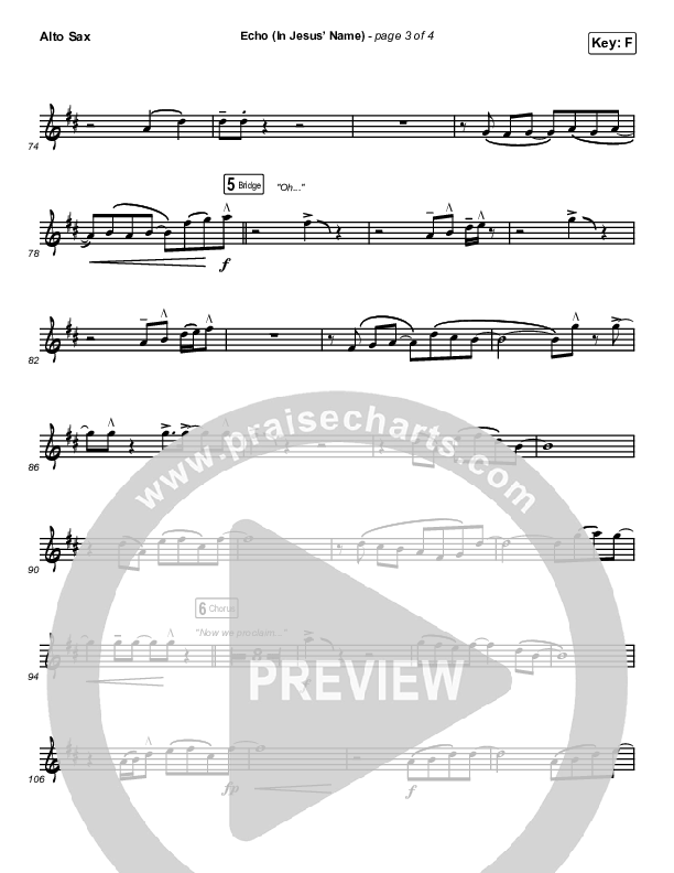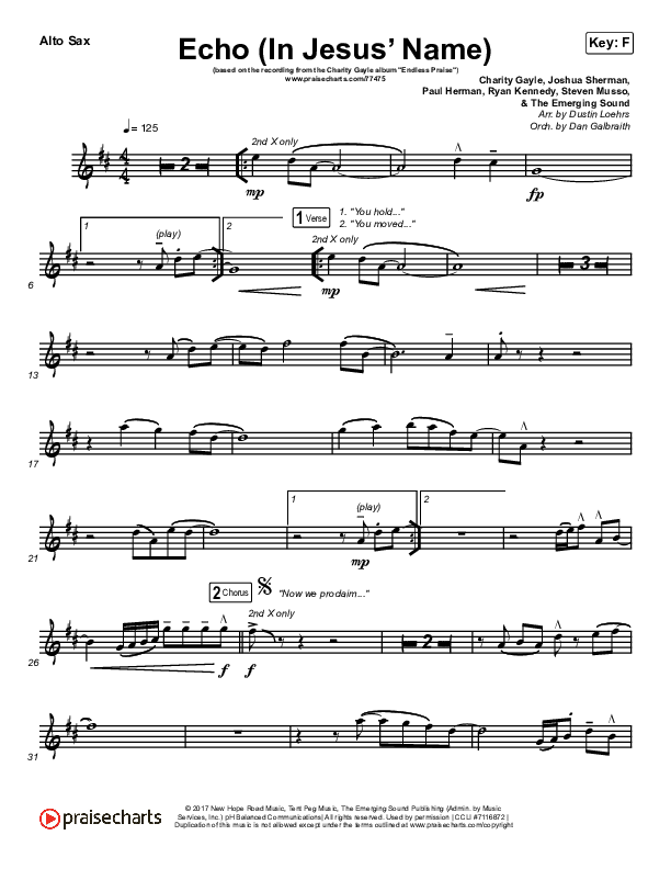 Download the AltoSax sheet music for Echo (In Jesus Name) by Charity Gayle, from the album Endless Praise. This song was arranged by Dustin Loehrs / Daniel Galbraith in the key of E, F.