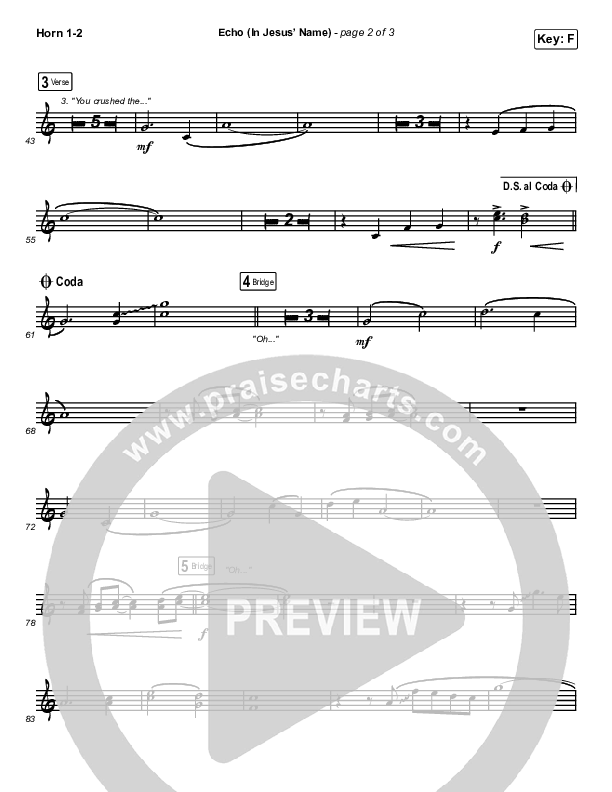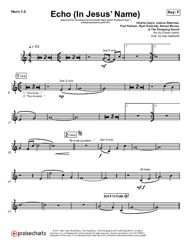 Download the Orchestration brass parts for Echo (In Jesus Name) by Charity Gayle, from the album Endless Praise. This song was arranged by Dustin Loehrs / Daniel Galbraith in the key of E, F.