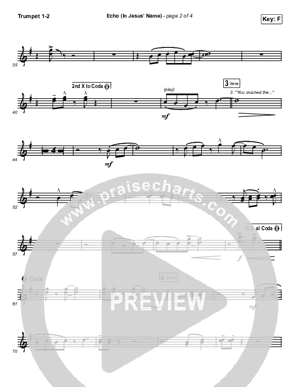 Download the trumpet sheet music for Echo (In Jesus Name) by Charity Gayle, from the album Endless Praise. This song was arranged by Dustin Loehrs / Daniel Galbraith in the key of E, F.