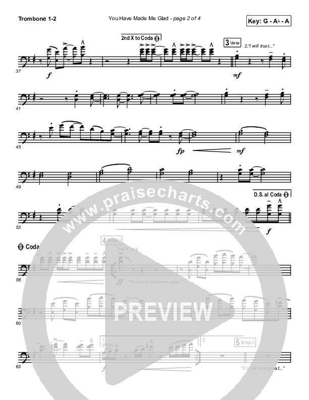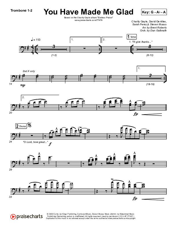 Download the Trombone 1,2 sheet music for You Have Made Me Glad by Charity Gayle, from the album Endless Praise. This song was arranged by Brent Roberts / Daniel Galbraith in the key of G, Gb.