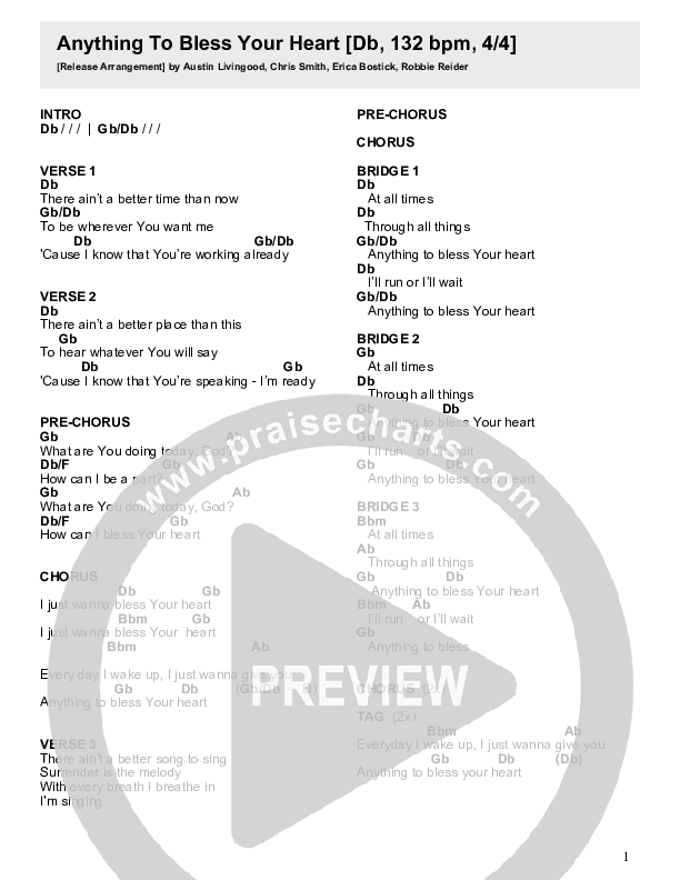 Download the PDF Chord Charts for Anything To Bless Your Heart by Crossroads Music, from the album Anything To Bless Your Heart.