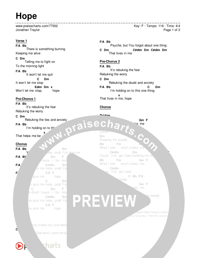 Download the PDF Chord Charts for Hope by Jonathan Traylor, from the album I'm Here For You.