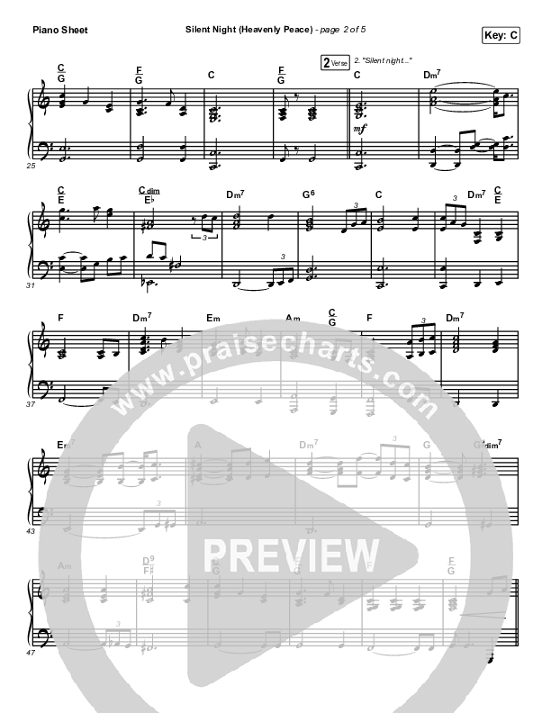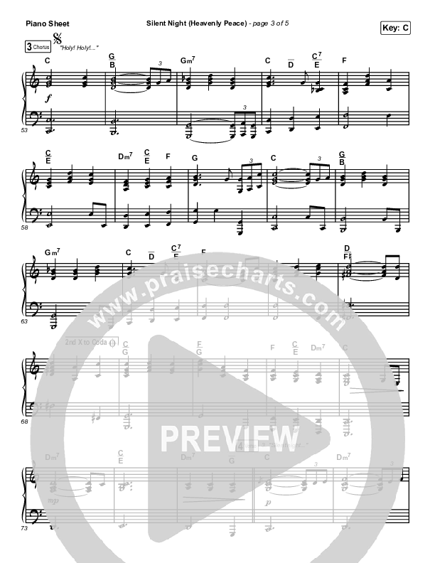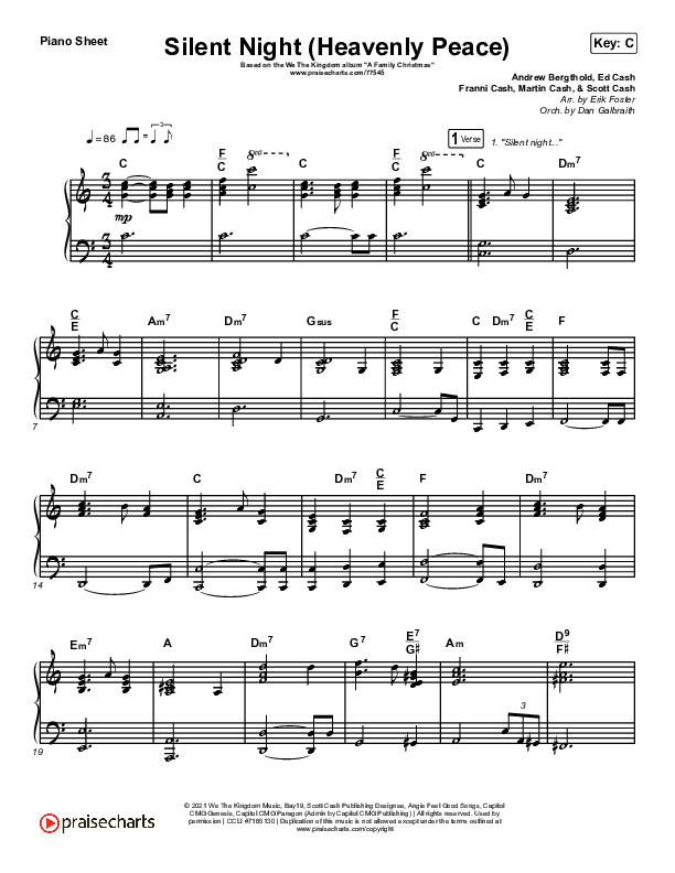 Download the piano sheet for Silent Night (Heavenly Peace) by We The Kingdom / Dante Bowe / Maverick City Music, from the album A Family Christmas. This song was arranged by Erik Foster / Daniel Galbraith in the key of Bb, C.