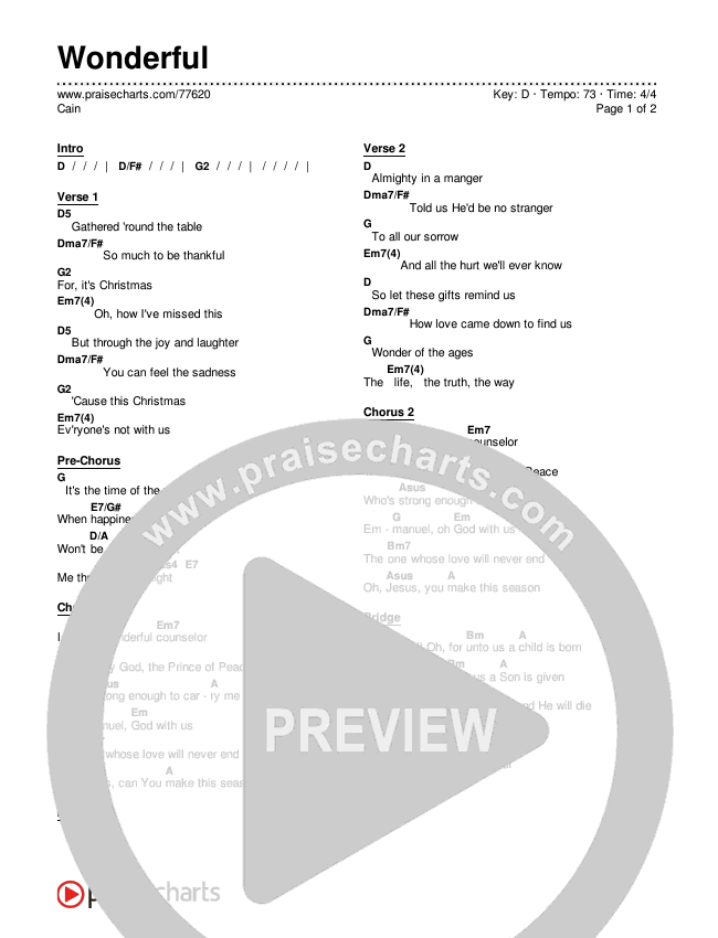 Download the PDF Chord Charts for Wonderful by CAIN, from the album Wonderful. This song was arranged by Daniel Galbraith in the key of D, Eb.