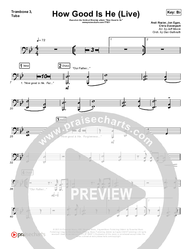 Download the Trombone 3/Tuba sheet music for How Good Is He (Live) by Vertical Worship, from the album How Good Is He. This song was arranged by Jeff Moore / Daniel Galbraith in the key of A, Bb.