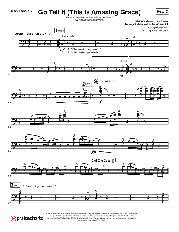 Download the Trombone 1,2 sheet music for Go Tell It (This Is Amazing Grace) by Life.Church Worship, from the album Gloria. This song was arranged by Grant Wall / Daniel Galbraith in the key of Bb, C.