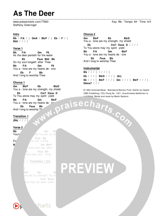 Download the PDF Chord Charts for As The Deer by Steffany Gretzinger, from the album Faith Of My Father. This song was arranged by Erik Foster in the key of Bb, C.