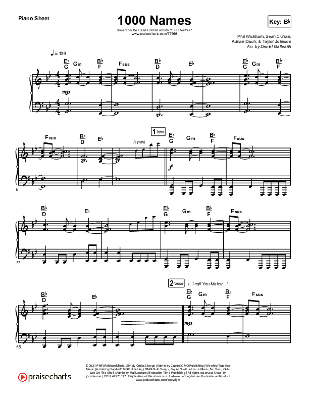 Download the Orchestration for 1000 Names by Sean Curran, from the album 1000 Names. This song was arranged by Daniel Galbraith in the key of A, Bb.