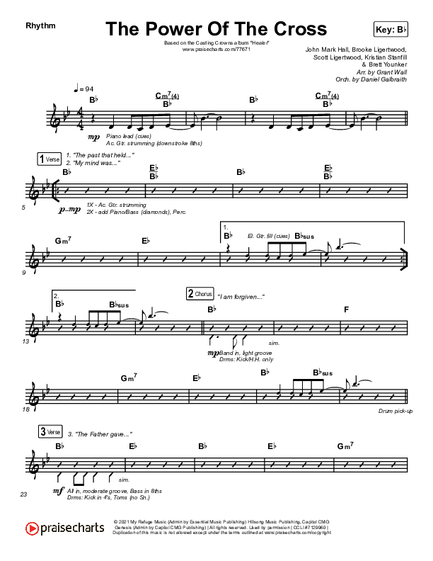 Download the Rhythm Chart for The Power Of The Cross by Casting Crowns, from the album Healer. This song was arranged by Grant Wall / Daniel Galbraith in the key of A, Bb.