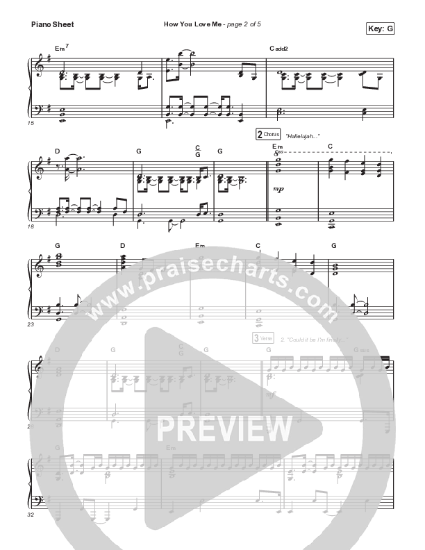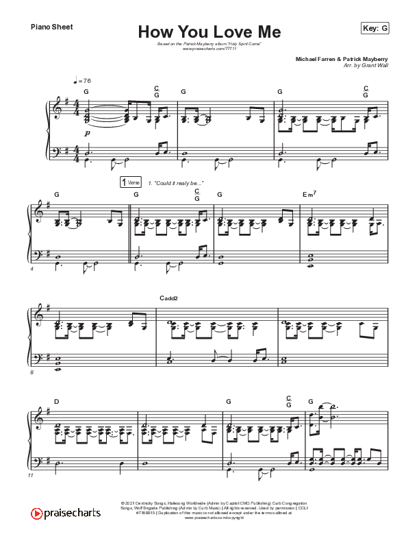Download the piano sheet for How You Love Me by Patrick Mayberry, from the album Holy Spirit Come. This song was arranged by Grant Wall in the key of Ab, G.