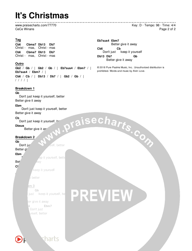 Download the PDF Chord Charts for It's Christmas by CeCe Winans, from the album Something's Happening. This song was arranged by Jeff Moore in the key of D, Db.