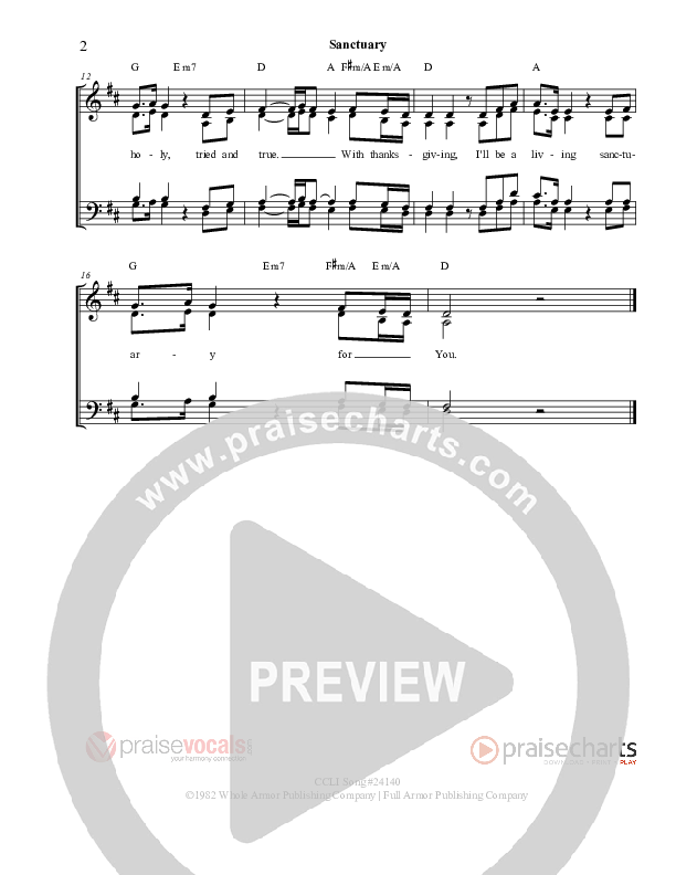 Download the sheet music for Sanctuary by PraiseVocals, from the album PraiseVocals Collection. This song was arranged by Patrick DeRemer in the key of D.