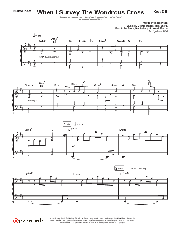 Download the piano sheet for When I Survey The Wondrous Cross by Keith & Kristyn Getty, from the album Confessio: Irish American Roots. This song was arranged by Grant Wall in the key of D, Eb, F.