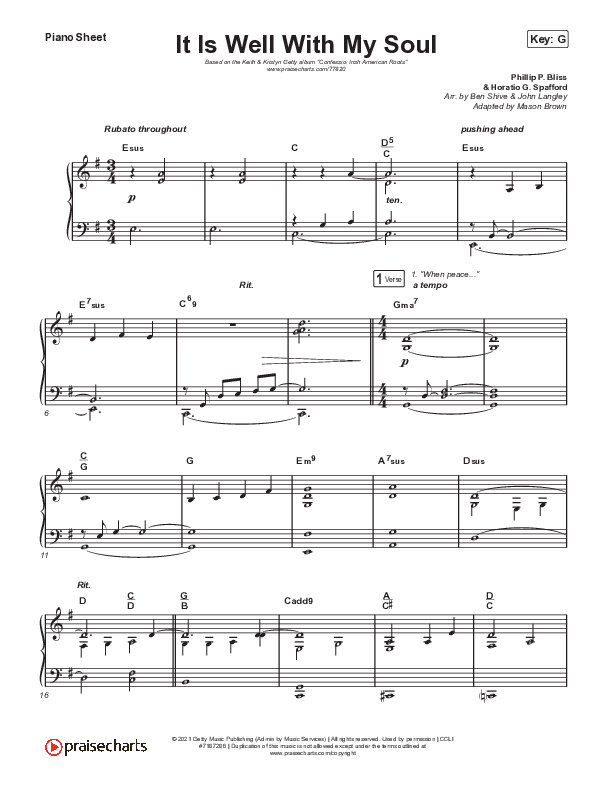 Download the piano sheet for It Is Well With My Soul by Keith & Kristyn Getty, from the album Confessio: Irish American Roots. This song was arranged by Mason Brown in the key of Bb, G.