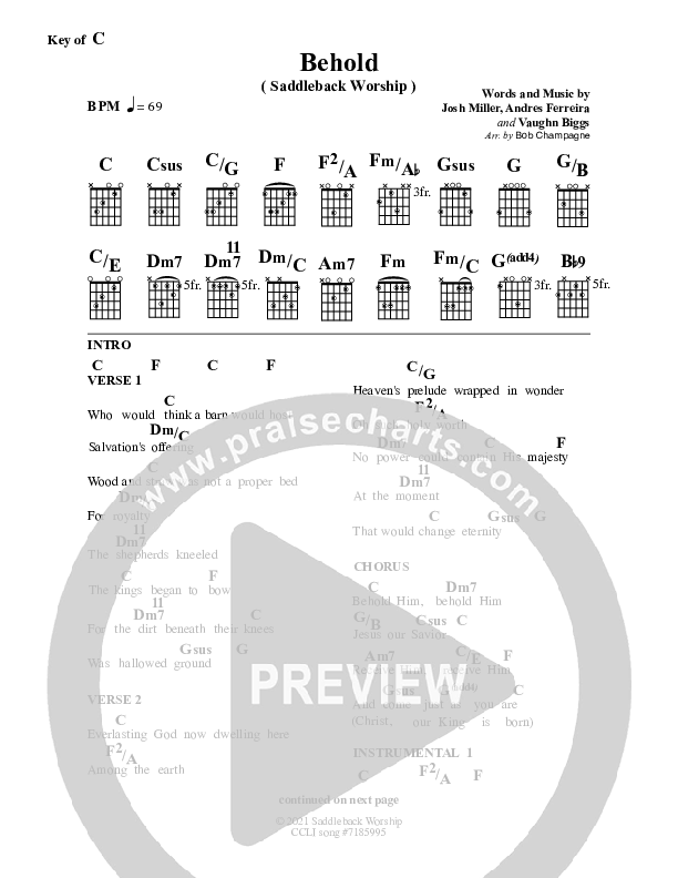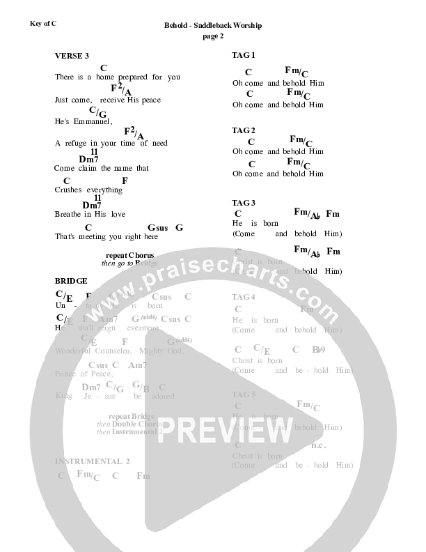 Download the PDF Chord Charts for Behold by Saddleback Worship, from the album Behold. This song was arranged by Bob Champagne in the key of C.