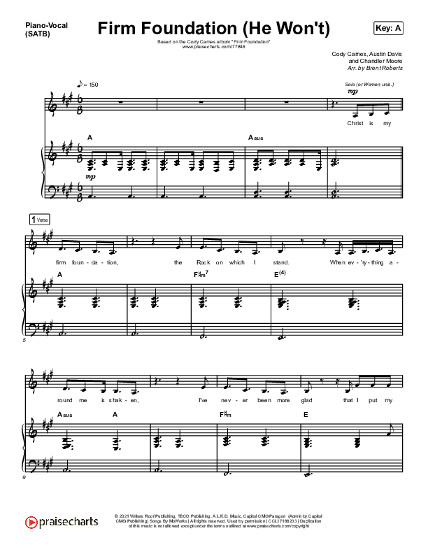 Download the sheet music for Firm Foundation (He Won't) (Live) by Cody Carnes, from the album Firm Foundation. This song was arranged by Brent Roberts / Daniel Galbraith in the key of A.