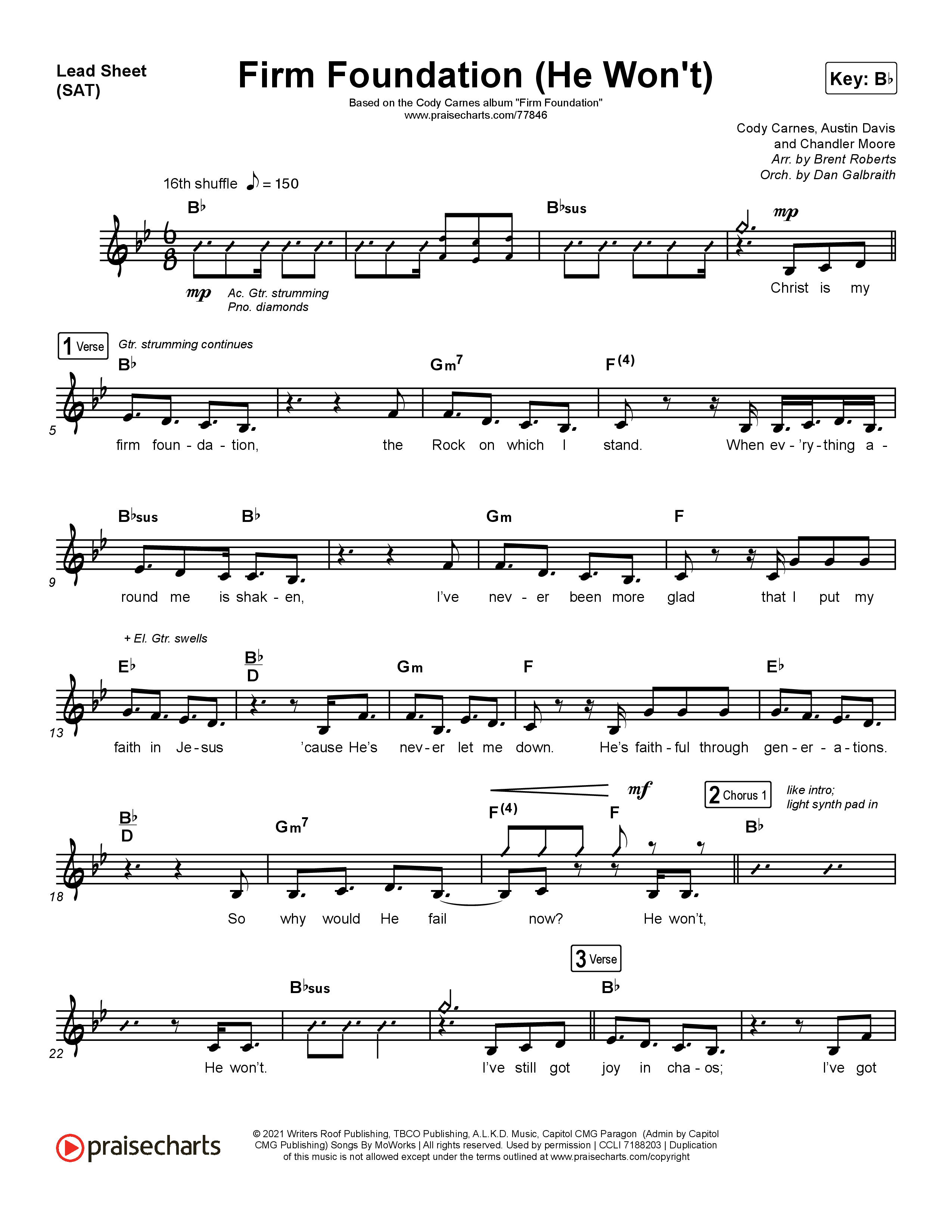 Download the sheet music for Firm Foundation (He Won't) (Live) by Cody Carnes, from the album Firm Foundation. This song was arranged by Brent Roberts / Daniel Galbraith in the key of A.