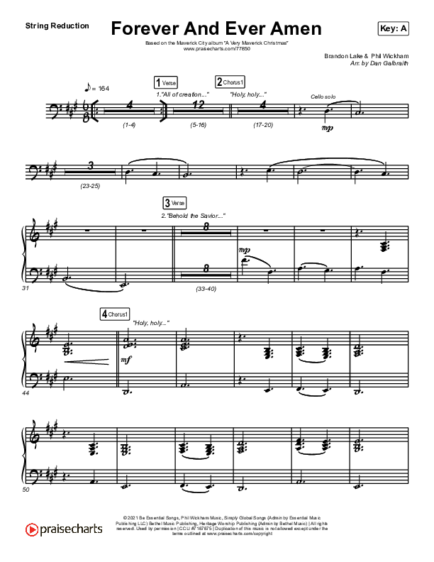 Download the String Reduction sheet music for Forever And Ever Amen by Maverick City Music / Brandon Lake / Phil Wickham, from the album A Very Maverick Christmas. This song was arranged by Daniel Galbraith in the key of A, Ab.