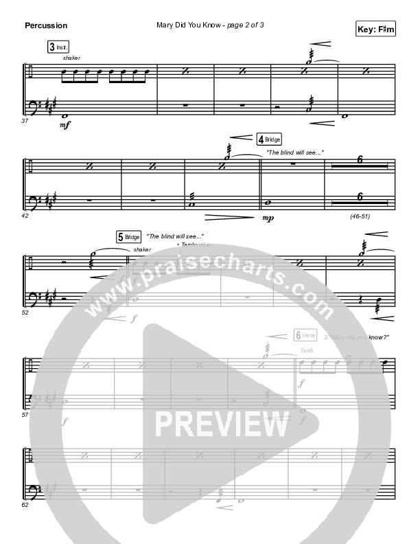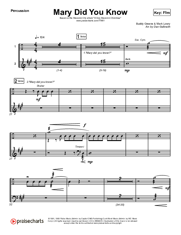 Download the percussion sheet music for Mary Did You Know by Maverick City Music / Lizzie Morgan / Chandler Moore, from the album A Very Maverick Christmas. This song was arranged by Daniel Galbraith in the key of F#m, Gm.