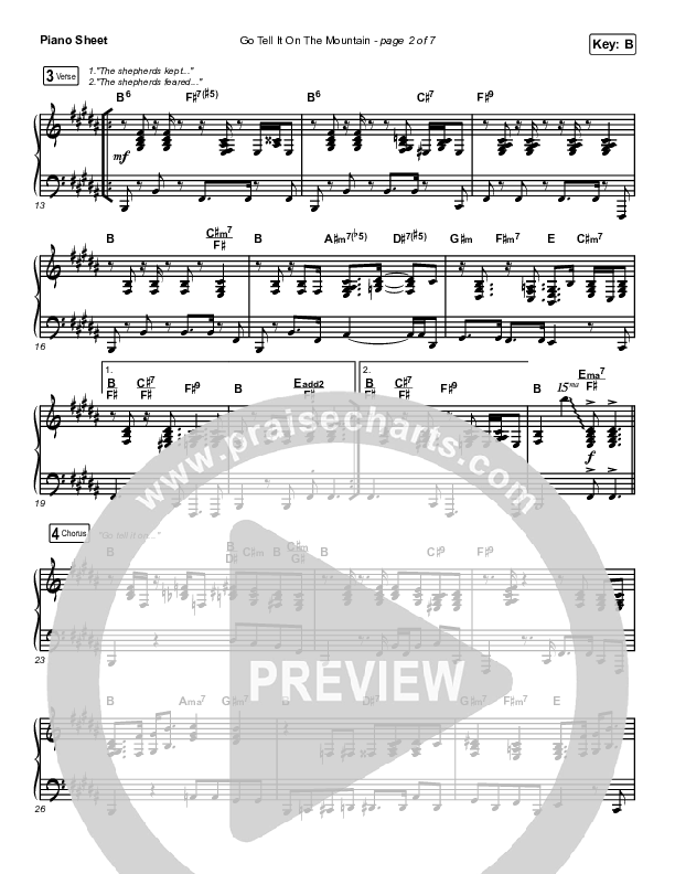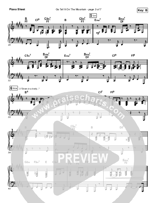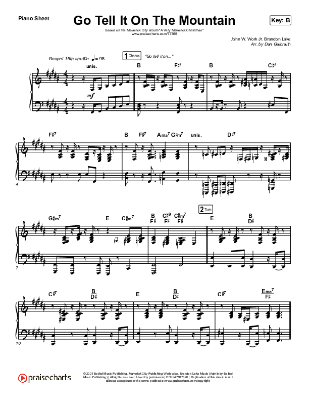 Download the piano sheet for Go Tell It On The Mountain by Maverick City Music / Melvin Chrispell III / Chandler Moore, from the album A Very Maverick Christmas. This song was arranged by Daniel Galbraith in the key of B, C.