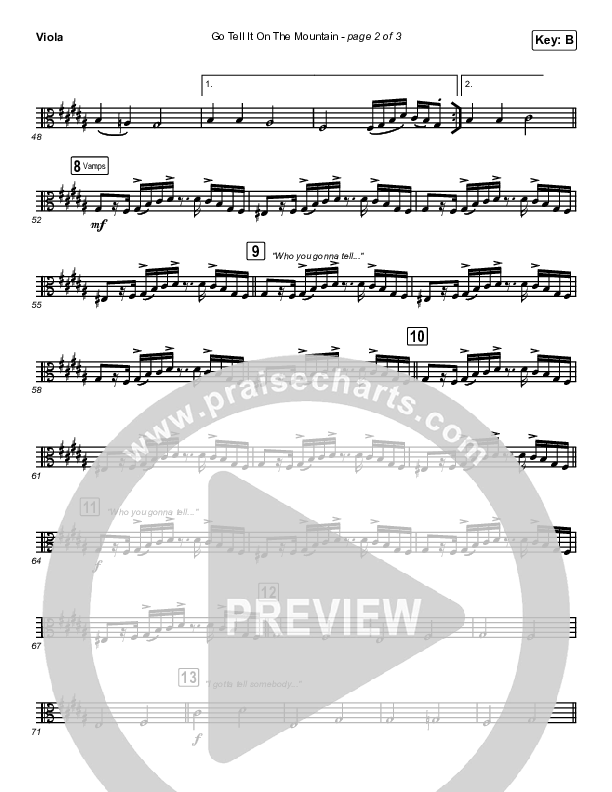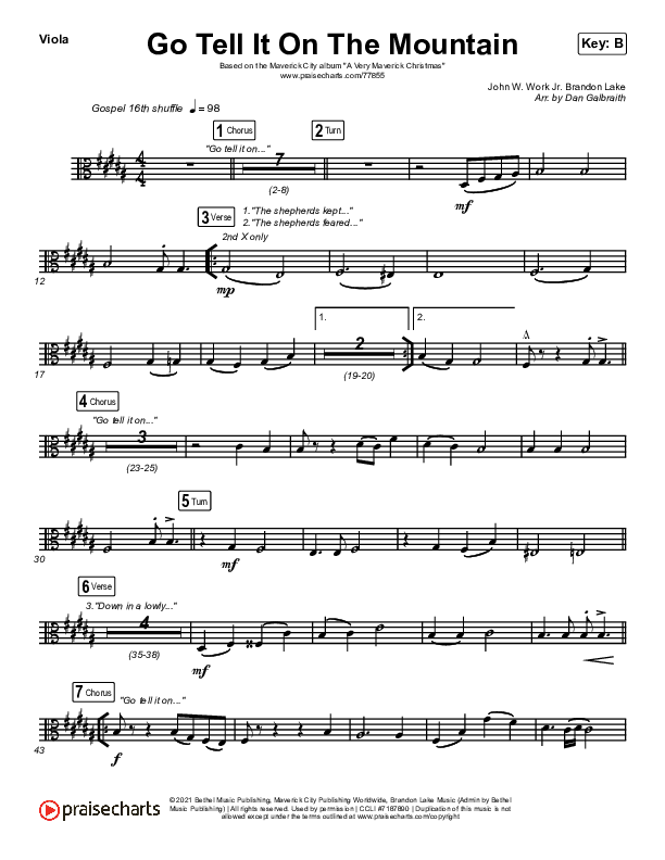 Download the Viola sheet music for Go Tell It On The Mountain by Maverick City Music / Melvin Chrispell III / Chandler Moore, from the album A Very Maverick Christmas. This song was arranged by Daniel Galbraith in the key of B, C.