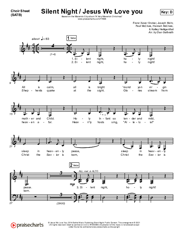 Download the Choir Sheet for Silent Night / Jesus We Love You by Maverick City Music / Brandon Lake / Phil Wickham / Kim Walker-Smith, from the album A Very Maverick Christmas. This song was arranged by Daniel Galbraith in the key of D, Eb.