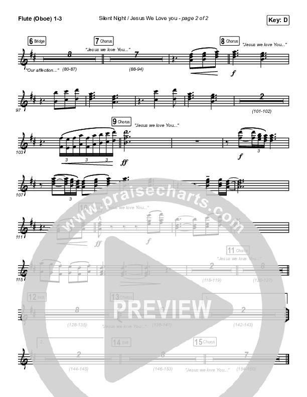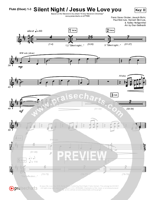 Download the Flute/Oboe sheet music for Silent Night / Jesus We Love You by Maverick City Music / Brandon Lake / Phil Wickham / Kim Walker-Smith, from the album A Very Maverick Christmas. This song was arranged by Daniel Galbraith in the key of D, Eb.