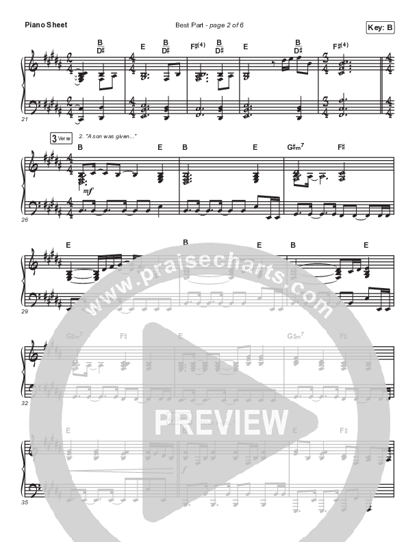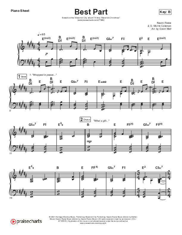 Download the piano sheet for Best Part by Maverick City Music / Naomi Raine / Chandler Moore, from the album A Very Maverick Christmas. This song was arranged by Grant Wall in the key of B, Bb.