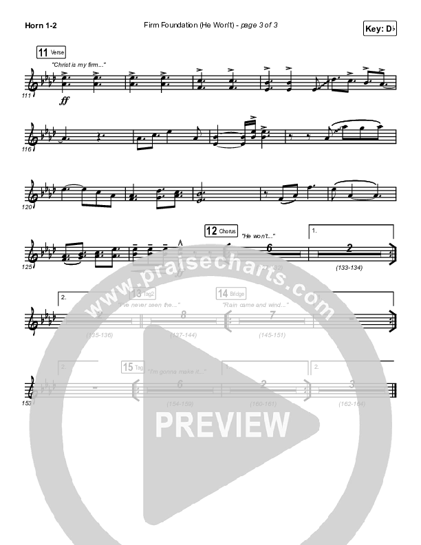 Download the French Horn sheet music for Firm Foundation (He Won't) (Live) by Cody Carnes / Chandler Moore / Maverick City Music, from the album Firm Foundation (He Won't). This song was arranged by Daniel Galbraith in the key of C, Db.