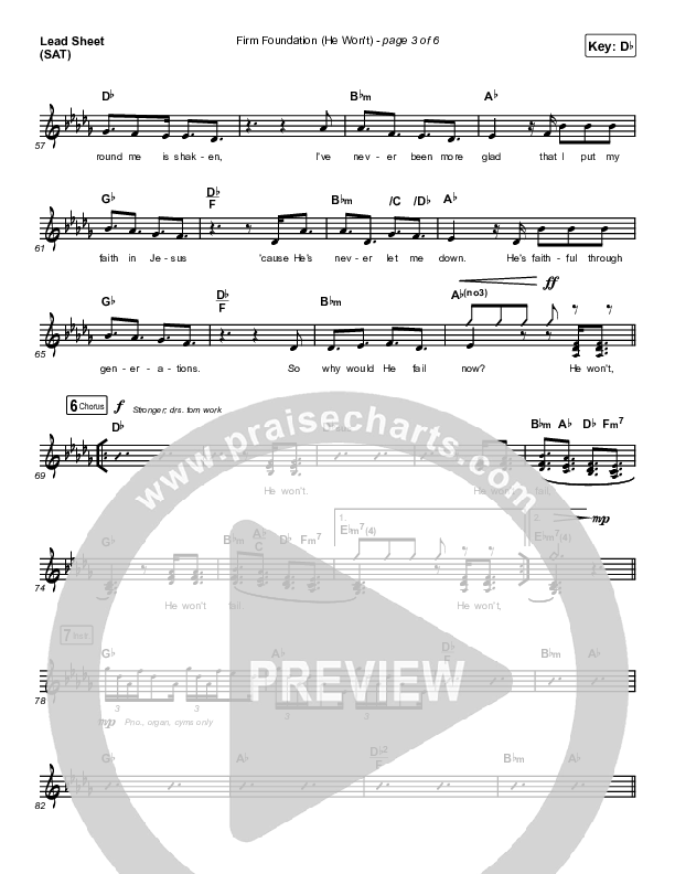Download the sheet music for Firm Foundation (He Won't) (Live) by Cody Carnes / Chandler Moore / Maverick City Music, from the album Firm Foundation (He Won't). This song was arranged by Daniel Galbraith in the key of C, Db.