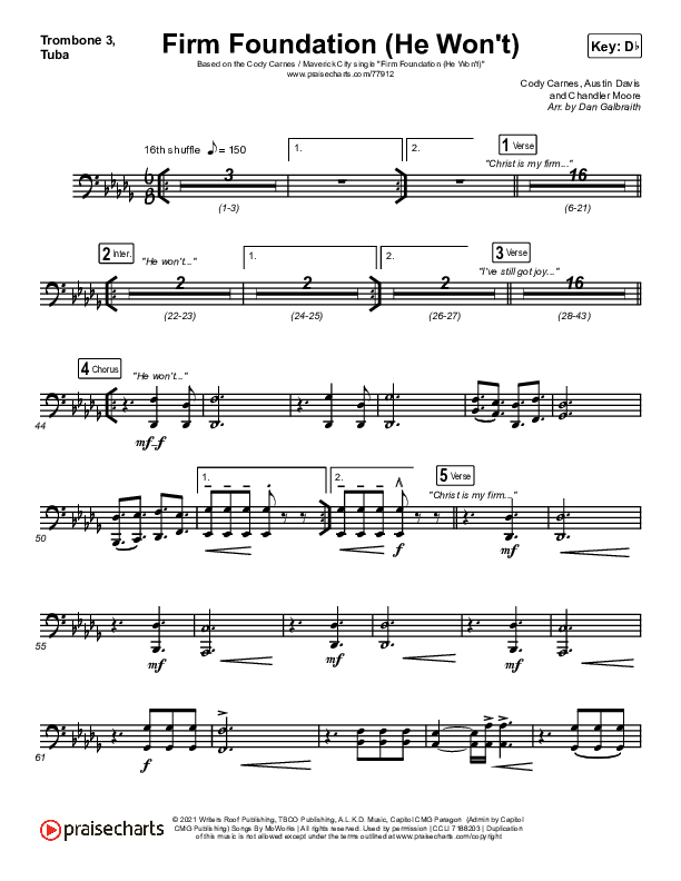 Download the Orchestration for Firm Foundation (He Won't) (Live) by Cody Carnes / Chandler Moore / Maverick City Music, from the album Firm Foundation (He Won't). This song was arranged by Daniel Galbraith in the key of C, Db.