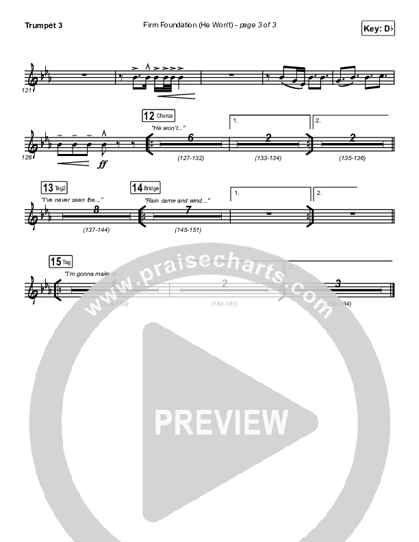 Download the Trumpet 3 sheet music for Firm Foundation (He Won't) (Live) by Cody Carnes / Chandler Moore / Maverick City Music, from the album Firm Foundation (He Won't). This song was arranged by Daniel Galbraith in the key of C, Db.
