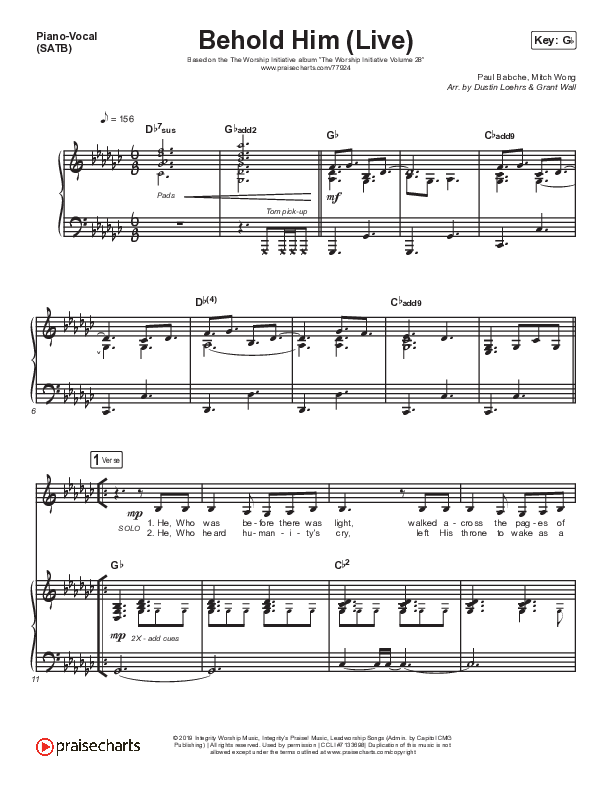 Download the sheet music for Behold Him (Live) by The Worship Initiative / Aaron Williams / John Marc Kohl, from the album The Worship Initiative Volume 28. This song was arranged by Dustin Loehrs / Grant Wall in the key of E, G, Gb.