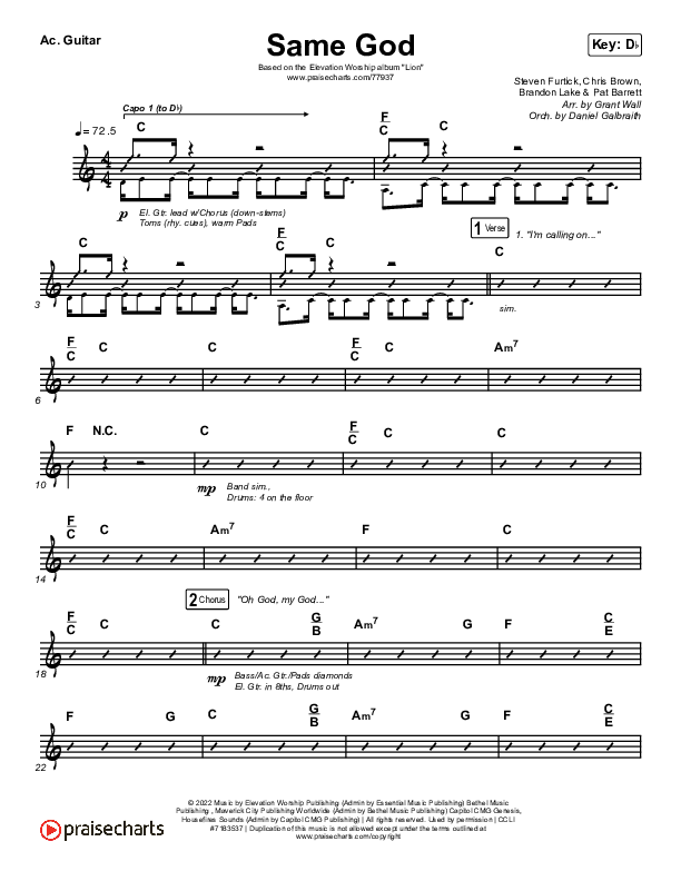 Download the Acoustic Guitar sheet music for Same God by Elevation Worship / Jonsal Barrientes, from the album LION. This song was arranged by Grant Wall / Daniel Galbraith in the key of B, Bb, C, D, Db, Eb.