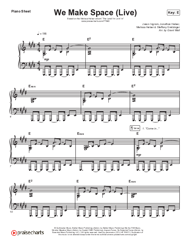 Download the Orchestration for We Make Space (Live) by Melissa Helser, from the album The Land I'm Livin' In. This song was arranged by Grant Wall in the key of E, Eb.